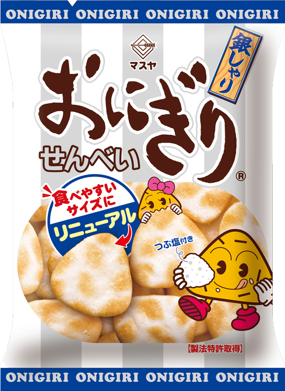1969年に誕生したおにぎりの形の三角形をかたどった、ソフトな食感のおせんべいです。ふっくらサクサクのお米の生地に「だし」のうまみにこだわった甘辛のしょうゆダレで味付けし、風味豊かな焼き海苔が振りかけられております。また、昨年発売10周年を迎えた『おにぎりせんべい 銀しゃり』は大きさの異なるつぶ塩がお米の旨味を引き立てる味わいでこちらも大人気商品です。