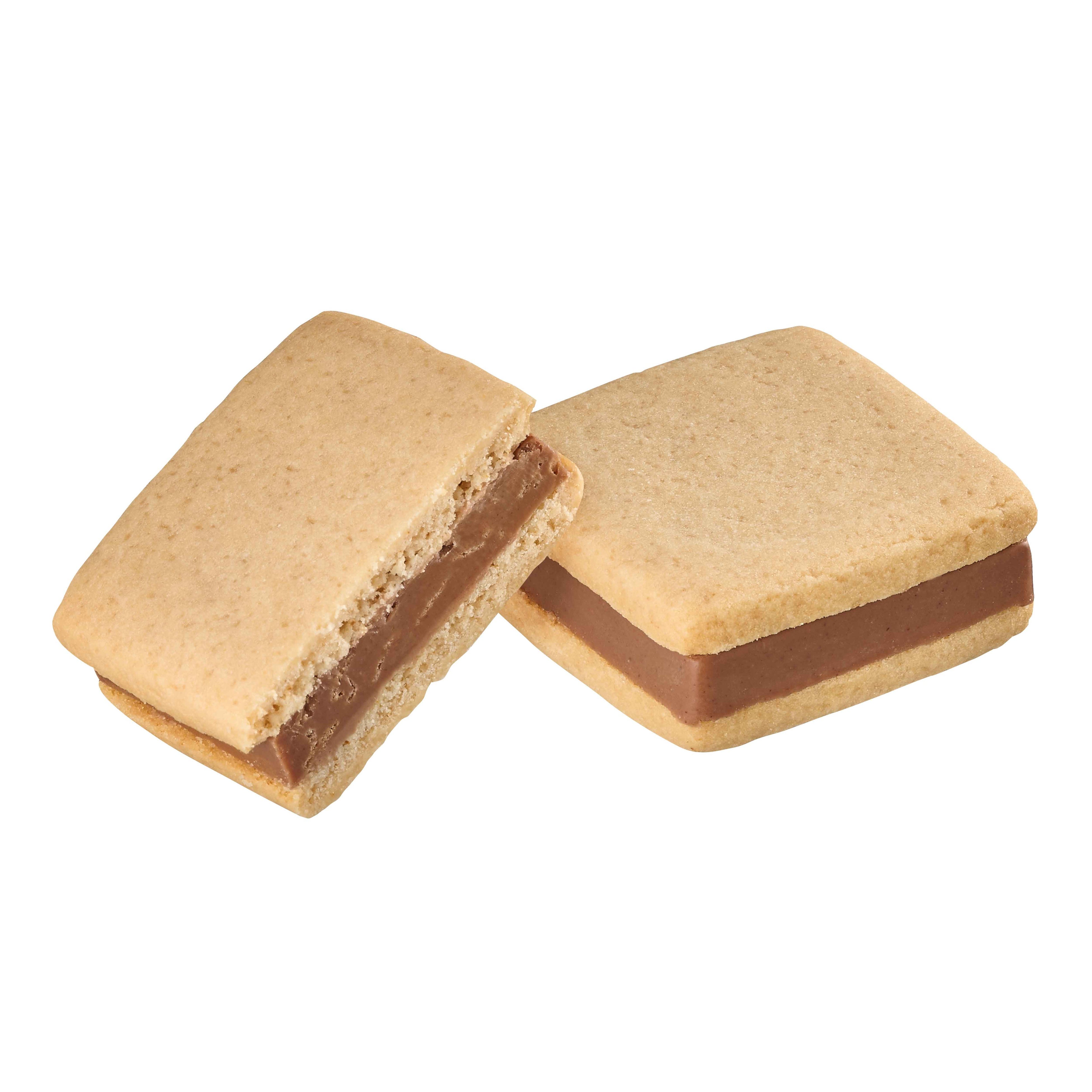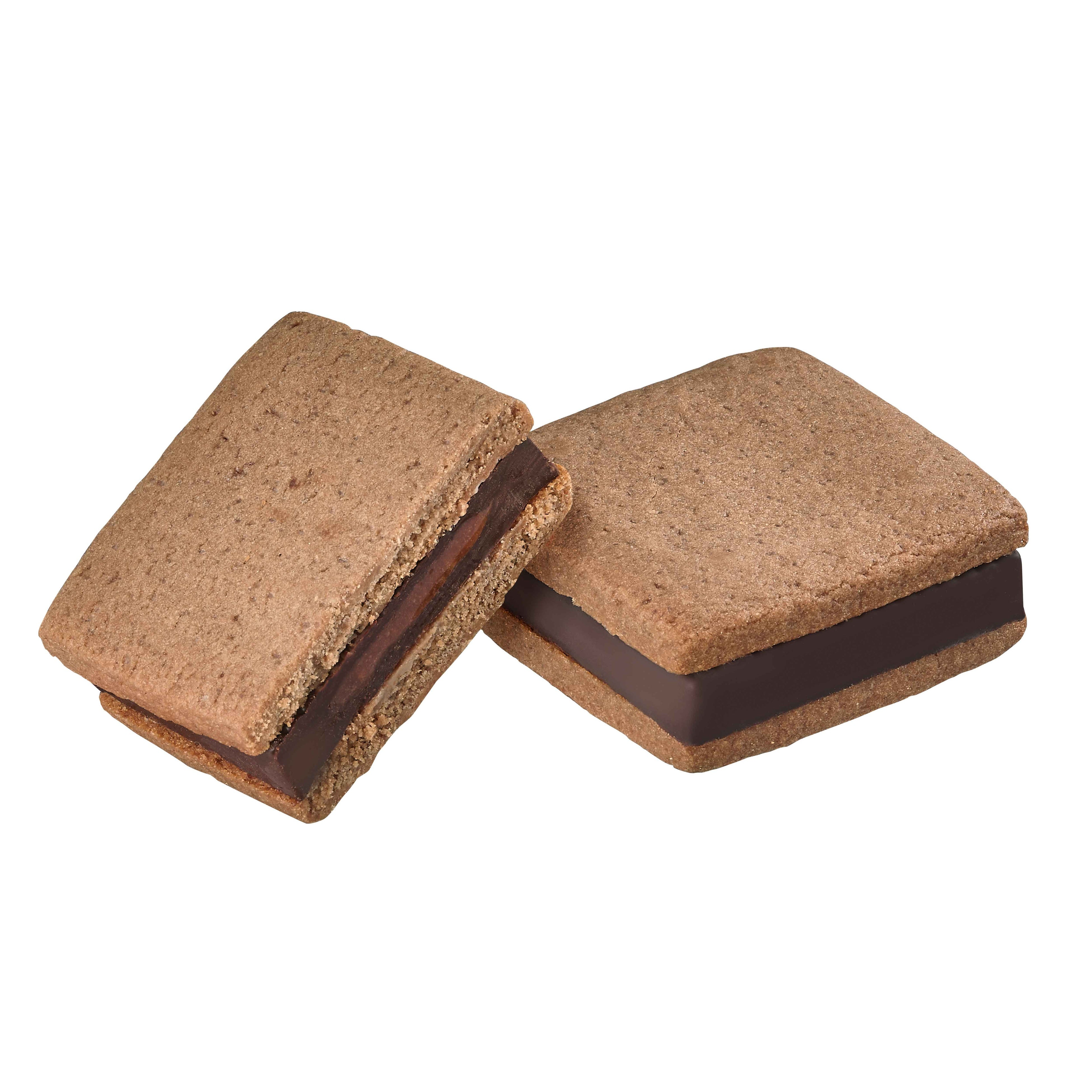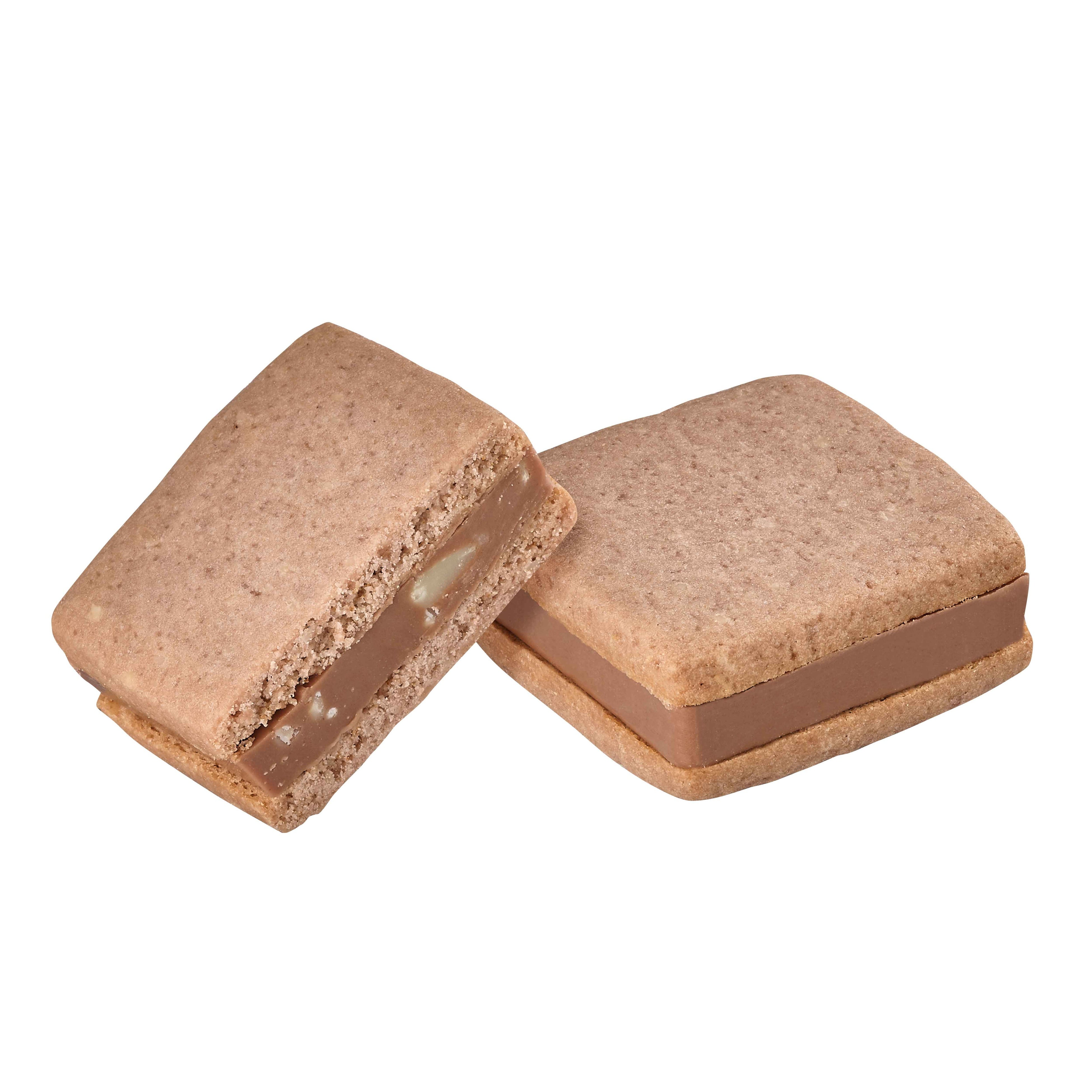 ヘーゼルナッツプラリネペーストとフィアンティーヌを丁寧に練りこんだミルクチョコレートガナッシュをアーモンドが香ばしいサブレでサンドしました。ガナッシュのザクザクとした食感とホロホロとほどけるサブレの絶妙な味わいです。