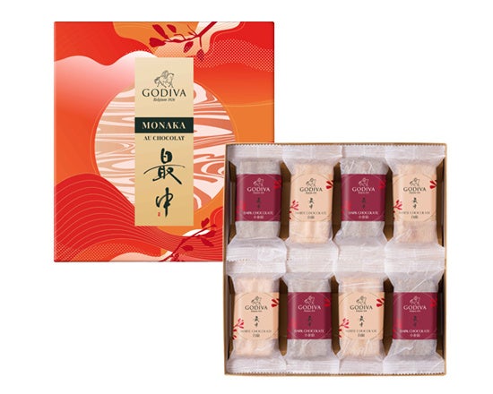 チョコレート餡と最中皮を別々に個包装しており、食べる瞬間にサンドして頂くことでサクサクの食感を感じていただけます。「ダークチョコレート小倉餡」と「ホワイトチョコレート白餡」の味わいをお楽しみいただけます。海外のデザイナーから見た日本の美しさを表現するとともに、日本の書道家によるオリジナルの「最中」で、和を意識した限定のパッケージデザインに仕上げました。
