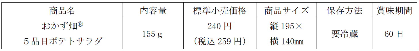今回、新たに発売する「おかず畑Ⓡ 5品目ポテトサラダ」は、お客様の「ポテトサラダはより具材感がほしい」というお声から開発されました。人気メニューであるポテトサラダに、枝豆・コーンなどの人気具材を加えることで、「多品目」という価値をさらにプラスした「おかず畑」ならではの商品です。