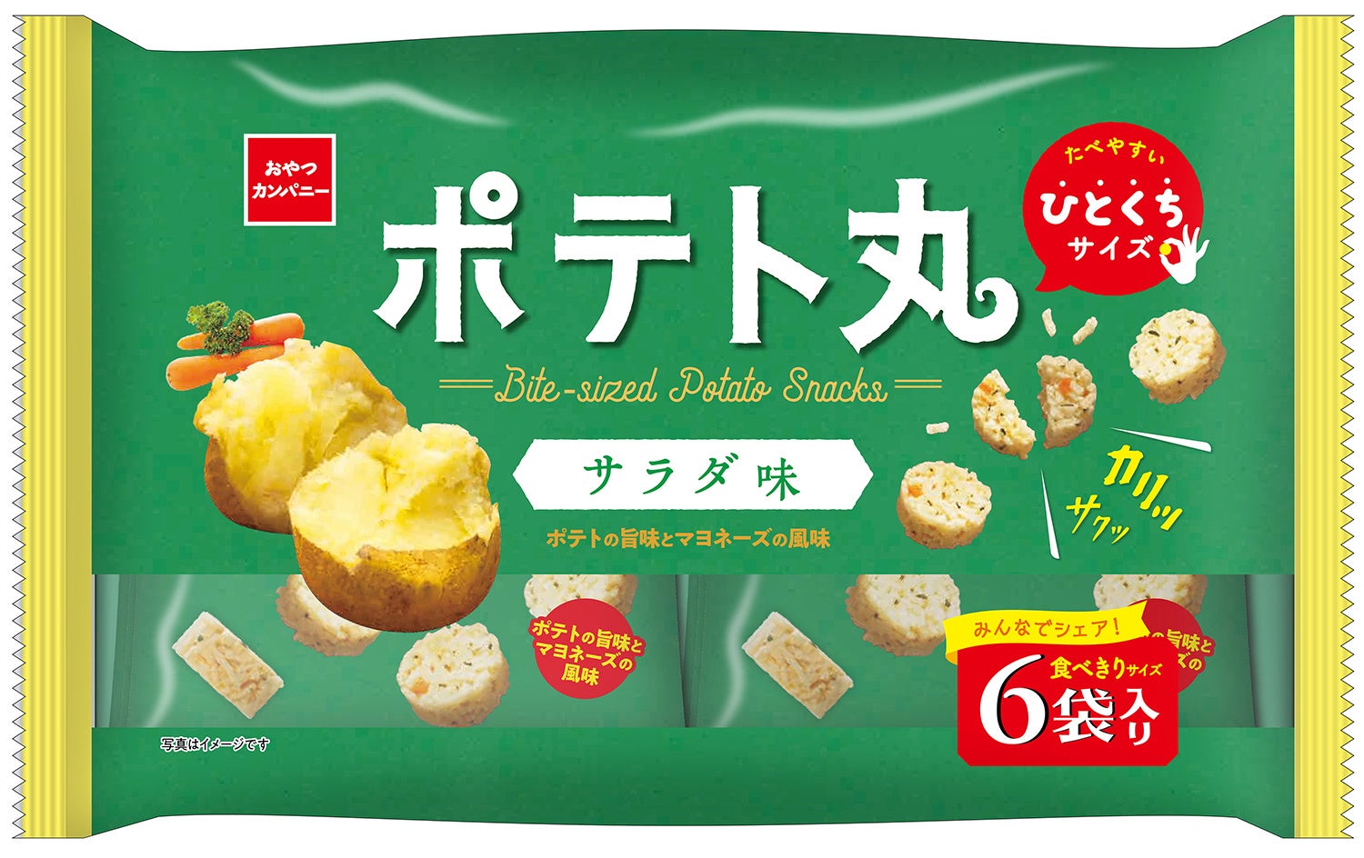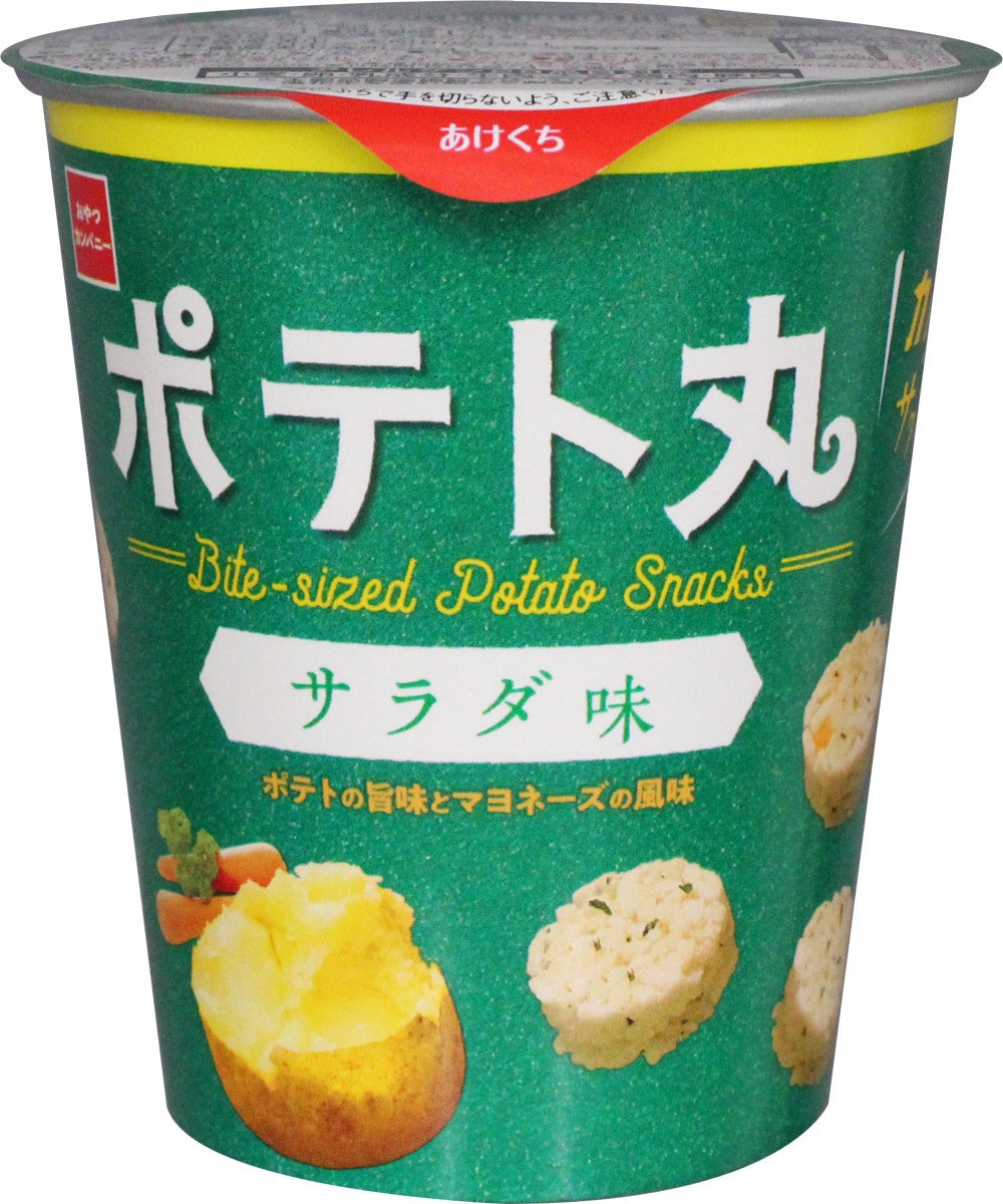 ひとくちサイズで食べやすいコロコロッと丸いカタチが生む、カリッサクッとした軽快な食感、口の中でホロホロッとほどける独特の食感変化を楽しめるポテト丸は、ひとくちで手軽にリフレッシュできる小粋な新感覚ポテトスナック菓子。日常のホッとひと息つきたいリフレッシュタイムに、ポテトの旨みとともにマヨネーズの風味が広がる「ポテト丸(サラダ味)」を是非、お楽しみください。
