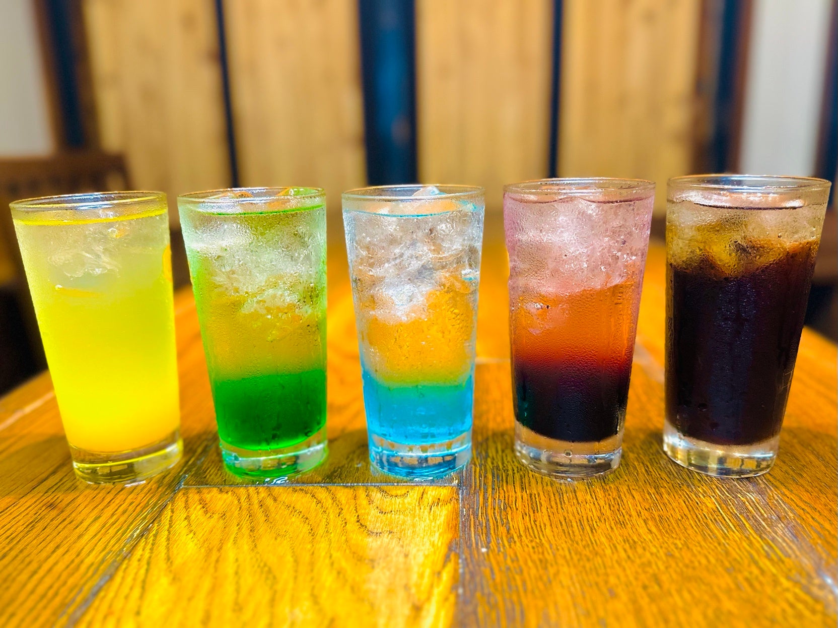 写真左から、パイナップルサワー、メロンサワー、ラムネサワー、グレープサワー、コーラサワー。特典にカード1枚(※無くなり次第終了)が付いてきます。
