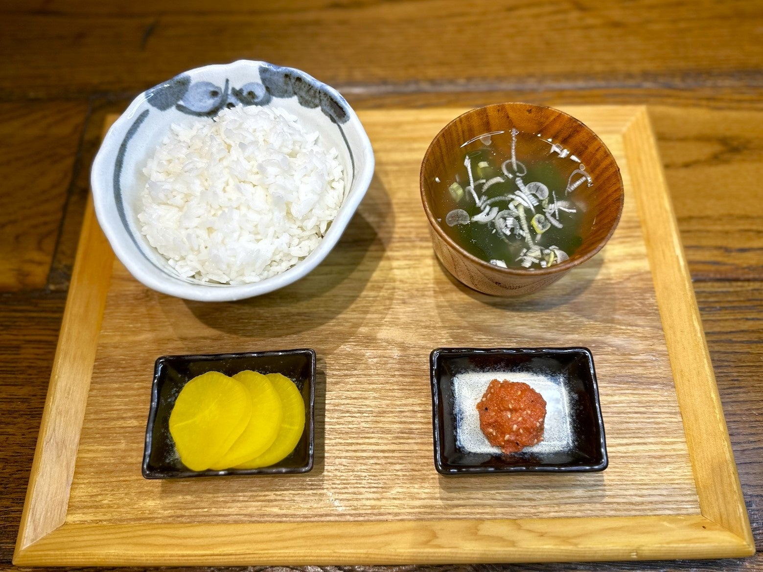 ご飯、わかめスープ、山椒明太、たくあん。特典にカード1枚(※無くなり次第終了)が付いてきます。