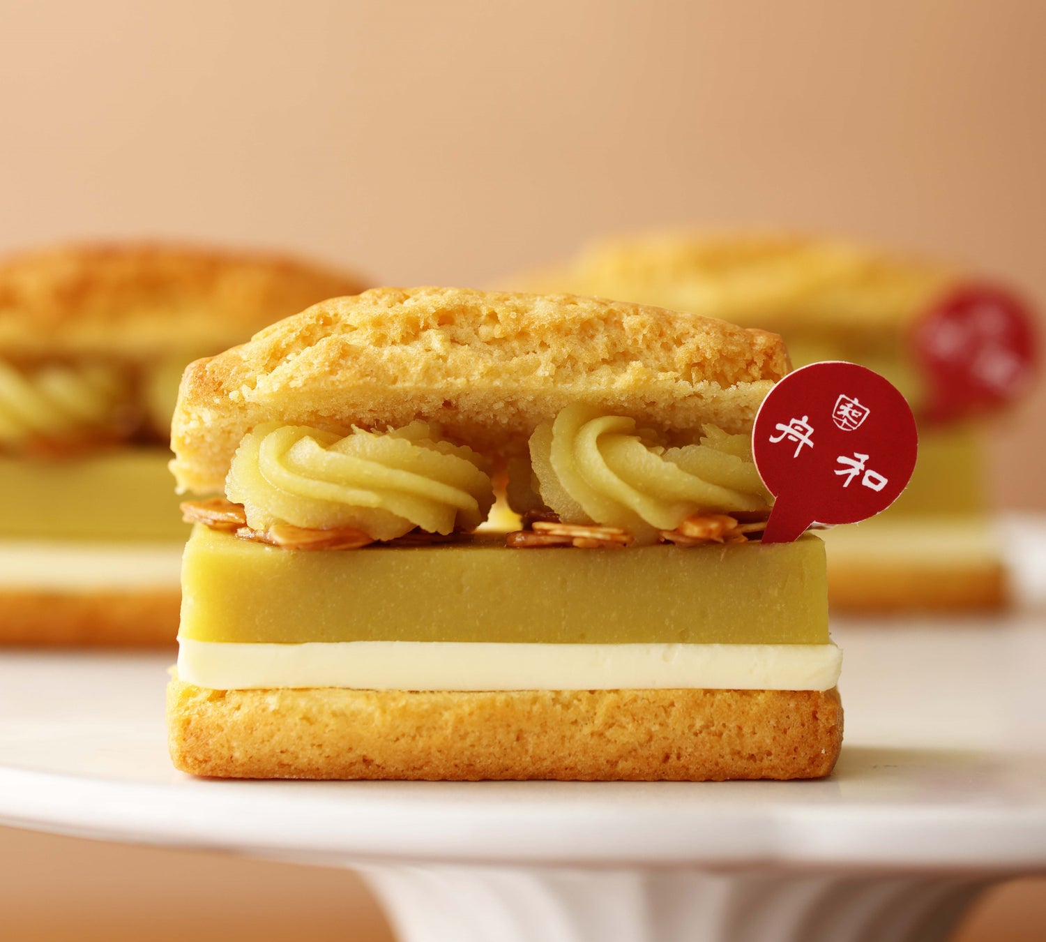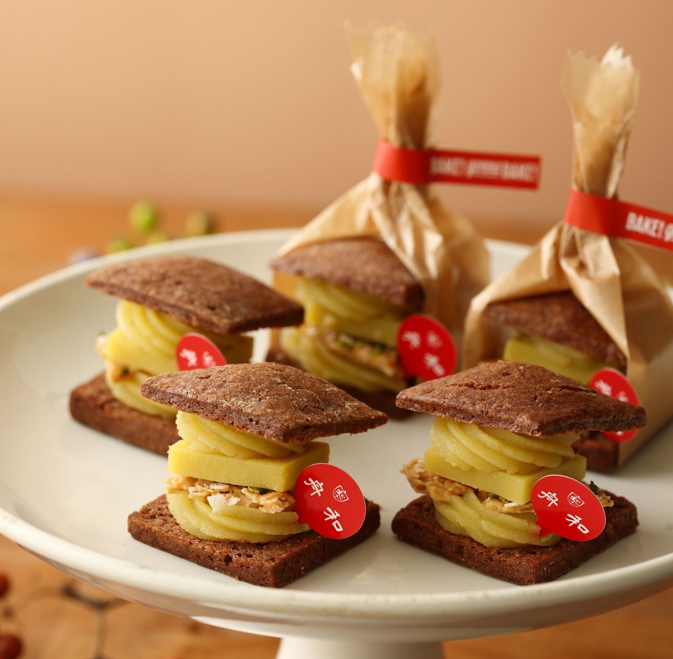 舟和の芋ようかんとさつまいもペーストを使用し、爽やかな酸味とコクが特徴の発酵バターと合わせ、アーモンドチュイールをサンドしました。