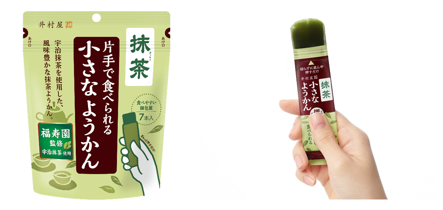 このたび「片手で食べられる小さなようかん」シリーズから、ようかんとして定番人気のフレーバーである抹茶味の『片手で食べられる小さなようかん 抹茶』を発売します。本商品は京都の老舗茶屋「福寿園」との取り組みにおける第4弾商品です。「福寿園監修」宇治抹茶を使用し、抹茶の旨み・渋みをお楽しみいただける本格的な抹茶ようかんに仕上げました。1本14gの食べきりサイズなので、いつでも・どこでも・手軽に、抹茶の風味が濃厚な本格的な抹茶ようかんをお楽しみいただけます。小腹がすいた時や、ほっと一息つきたいタイミングにおすすめです。また、賞味期間は1年間と長持ちするので、買い置き菓子としても最適です。