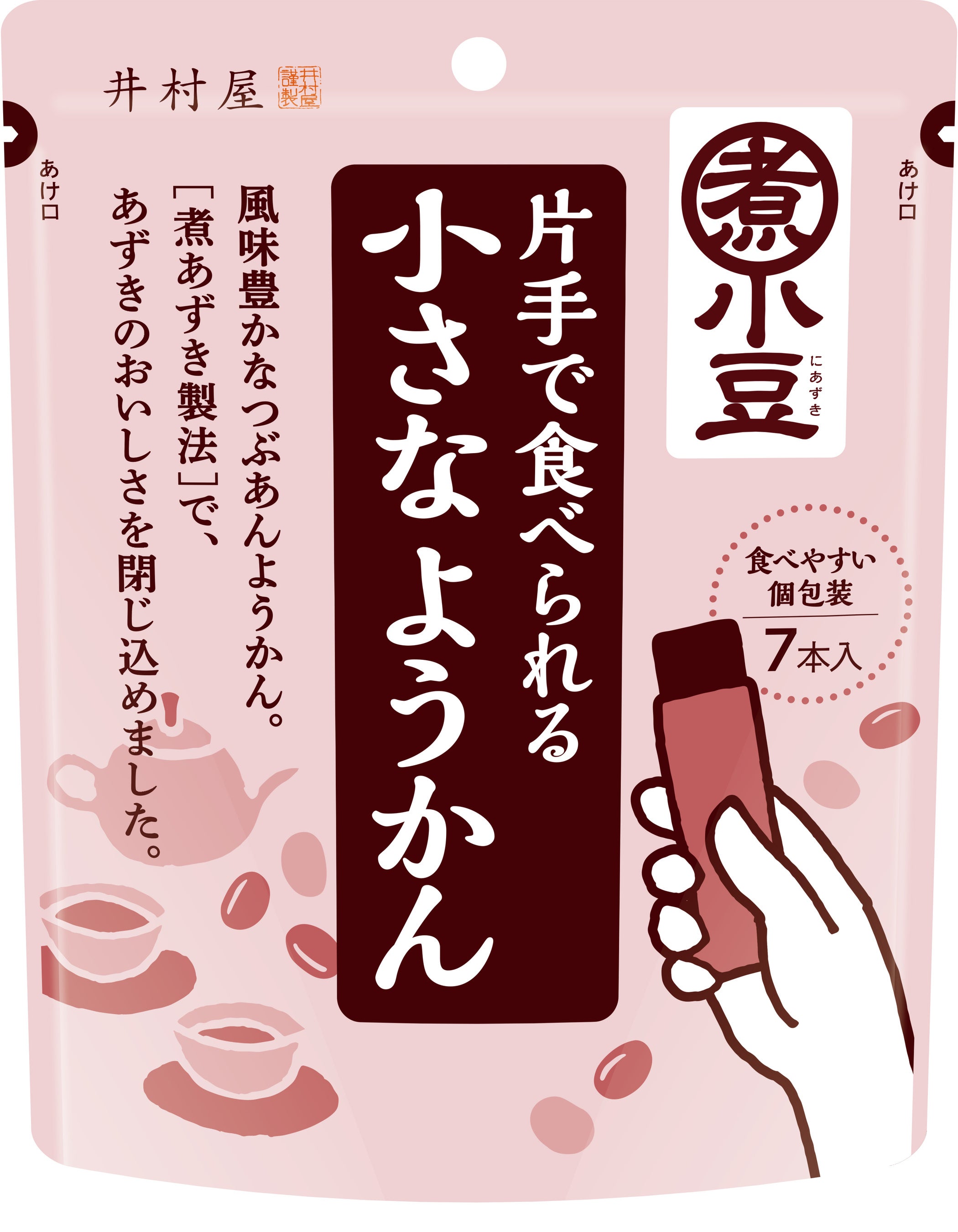 この商品で採用している井村屋独自の「ギュッと押すだけパッケージ」(特許第6114206号)は、小容量で個包装、さらに押し出すだけで手を汚さずに手軽に食べられる工夫をこらしたパッケージです。ギュッと押すだけで簡単に開封して食べられる「簡便性」や、手を汚さずに食べられる「衛生面」においてお客様からご評価いただいています。中でも「煮あずき製法」で炊き上げたあずきの風味豊かなつぶあんを使用したようかん『片手で食べられる小さなようかん』は、2019年に前身である「煮小豆ようかん」からリニューアル発売して以来、多くのお客様から手軽に本格的なようかんをちょこっとずつ楽しめると評価いただいている、シリーズの人気商品です。