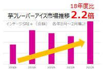 芋フレーバーのアイス市場は近年拡大傾向にあります。2022年度については2018年度比で2.2倍と拡大し、ますます芋フレーバーの人気が高まっています。また、「蜜芋ブリュレ」については専門店など取り扱うお店が増えており、トレンドとなっております。