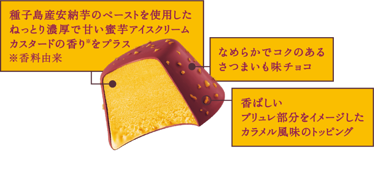 蜜芋アイスクリームには種子島産安納芋のペーストを使用し、ねっとり濃厚で甘い蜜芋の味わいが感じられます。さらにカスタードの香り※を効かせ、さつまいも味チョコには香ばしいブリュレ部分をイメージしたカラメル風味のトッピングを混ぜ込むことで、蜜芋ブリュレの味わいと食感の再現性を高めています。※香料由来
