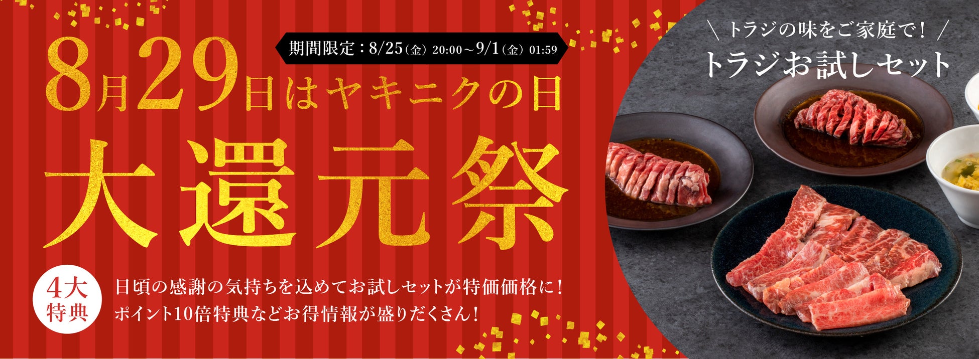 株式会社トラジ(本社:東京都江東区、代表取締役社長:金 信彦)は、公式通販サイト(焼肉トラジ オンラインストア)にて8月29日の「ヤキニクの日」を含む、2023年8月25日(金)20:00 ~ 9月1日(金)1:59の期間、年に一度の「大還元祭」として、通常7,200円相当の「トラジお試しセット」を4,980円(送料込み)での限定販売をはじめ、2,0100円相当の黒毛和牛満喫セットが特別価格1,7200円、対象商品がポイント10倍などのキャンペーンを開催いたします。