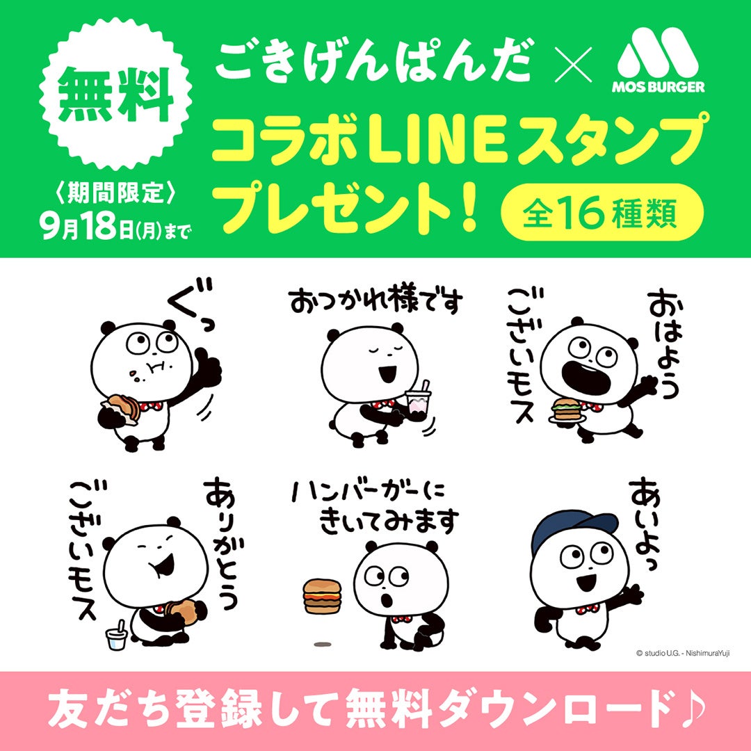 モスバーガーを展開する株式会社モスフードサービス(代表取締役社長:中村 栄輔、本社:東京都品川区)は、人気クリエイターにしむらゆうじさんの「ごきげんぱんだ」とのコラボLINEスタンプを8月22日(火)より配信いたします。