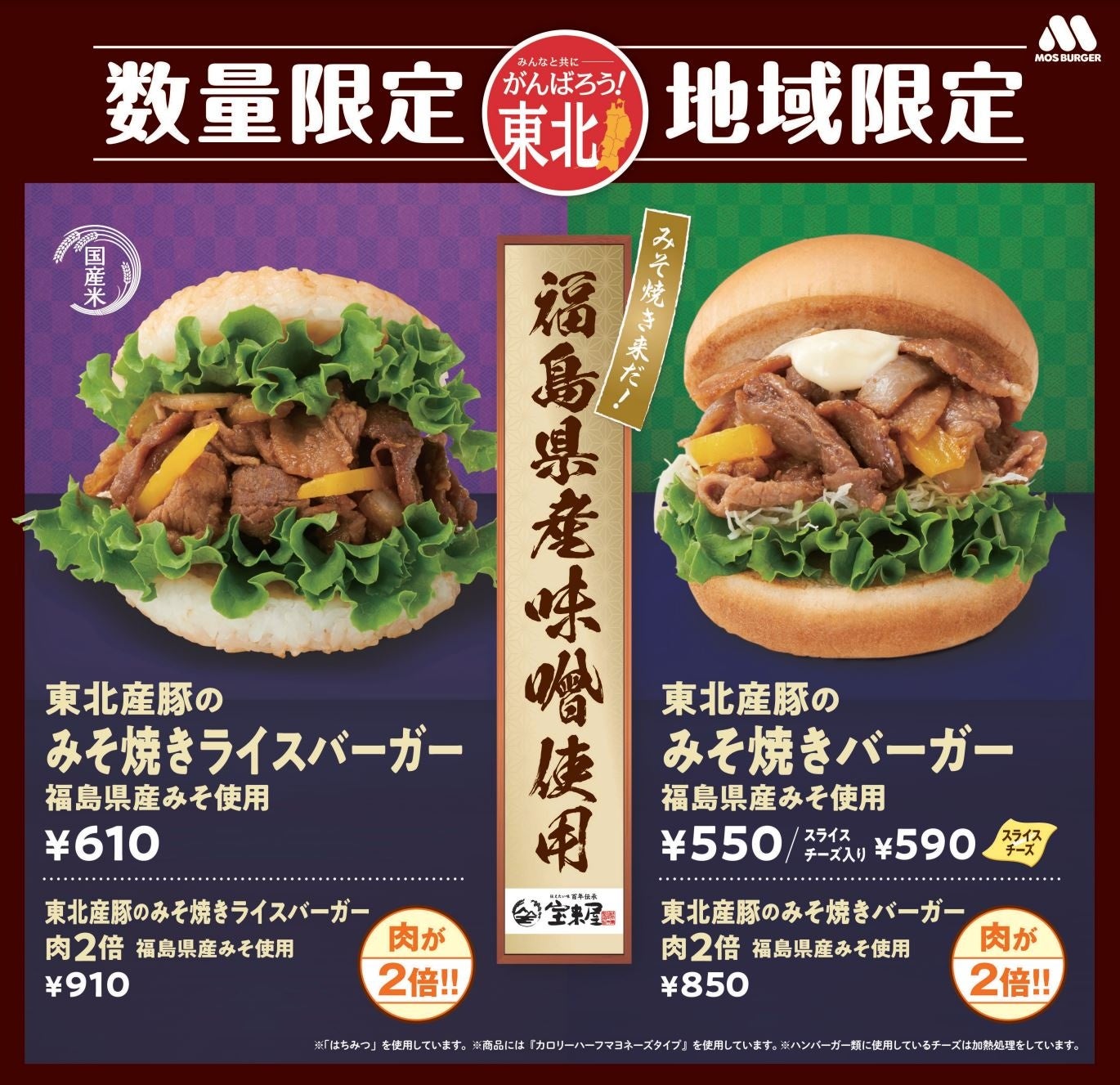 当社では“モスバーガーが東北を元気にする”をテーマに、東北産食材を使用したハンバーガーを2017年より、2018年からはシェイク商品を加え、数量・地域限定で販売し、毎年東北の皆さまに大変ご好評いただいています。昨年、100年以上に渡り、伝承されている糀製法を用いて製造された宝来屋※1のみそを使用した「東北産豚のみそ焼きバーガー 福島県産みそ使用」「東北産豚のみそ焼きライスバーガー 福島県産みそ使用」を販売し、大変ご好評いただいたことから、今年も宝来屋のみそを使用した商品を販売します。