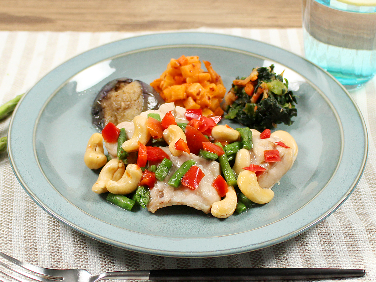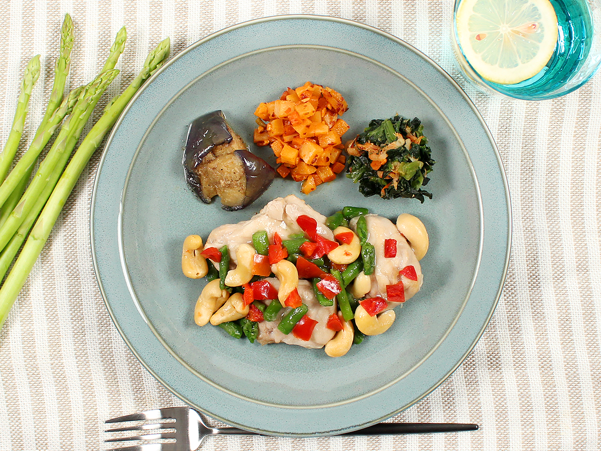 蒸した鶏もも肉に、ネギ油香る鶏ガラベースの中華あんをかけました。アスパラ、赤パプリカ、カシューナッツをトッピングしておりますので、よく混ぜてお召し上がりください。