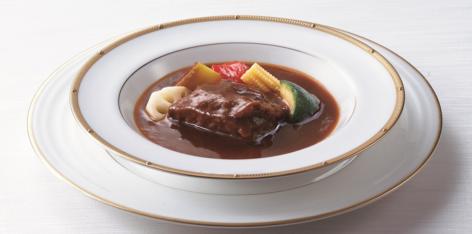 ご紹介する和風ビーフシチューは、ジョン・カナヤこと金谷鮮治氏が自身の集大成として1978年に開業した「鬼怒川金谷ホテル」で誕生。稀少部位である黒毛和牛のほほ肉をデミグラスソースとフォンドヴォーでじっくりと煮込みました。鮮治氏がレストラン「西洋膳所ジョンカナヤ麻布」で掲げていたコンセプト“箸で食べるフレンチ” 。そのコンセプトは大切に受け継がれており、ごろっと大きな肉は箸でもほろりと簡単にほぐれる柔らかさです。さらに赤味噌を隠し味に使うことで、牛肉の旨味と野菜の甘さが溶け込んだシチューは日本人の味覚に合う食べ飽きない味に。ロマンあふれる至福の味をぜひご家庭でお愉しみください。