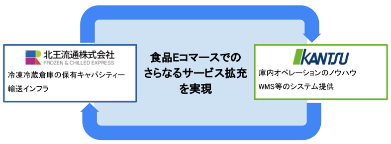 北王流通は、冷凍冷蔵の輸送インフラや冷凍冷蔵倉庫のキャパシティーを強みとし、関通は、庫内オ ペレーションのノウハウやWMS等のシステムを強みとしています。