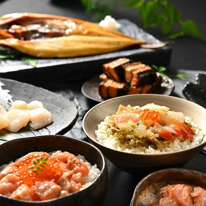 北海道の海の幸がぎっしり。特製のタレで骨まで柔らかく煮込んだサーモンハラス昆布巻き、オホーツク海産の肉厚ホタテ、贅沢な海鮮漬など、高品質な素材が惜しげもなく使われている。利尻昆布を使った干物はダシが効いていて、実に上品。食べ進むほどに笑みがこぼれる。
