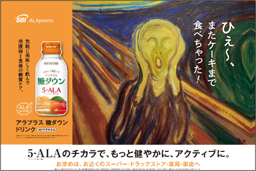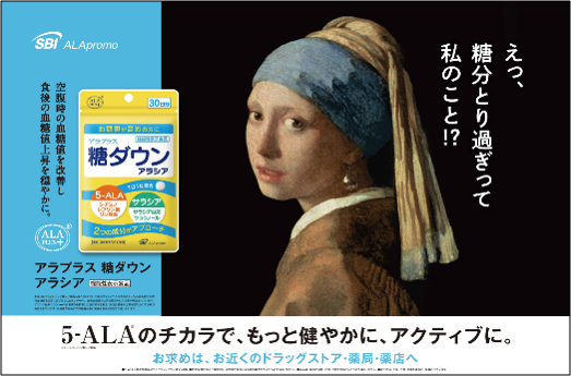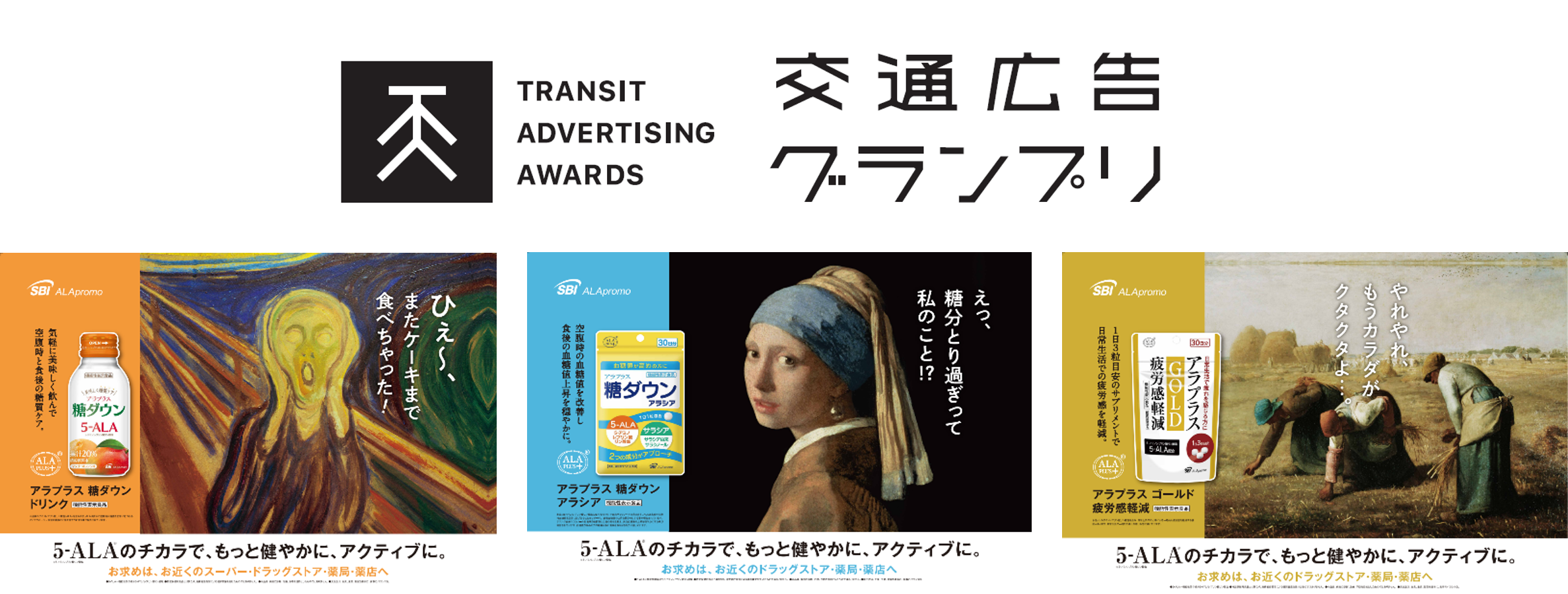 2022年10月に機能性表示食品「アラプラス 糖ダウン ドリンク」「アラプラス 糖ダウン アラシア」「アラプラス ゴールド 疲労感軽減」の3商品にて実施した、世界の有名絵画をモチーフにした交通広告(JR東日本 ドア横ポスター)は、各商品と名画のそれぞれの特長を融合させることで、ひと目で好奇心を描き立て心に残る広告となったことが評価され受賞に至ったと考えられます。