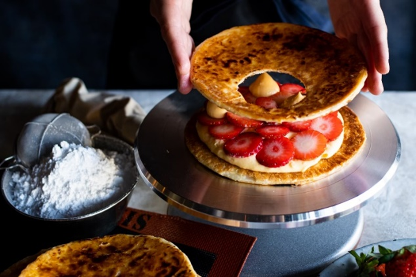 パイ生地をプレス機で焼く瞬間の香ばしい薫りや、フレッシュな自家製カスタード、こだわりの食材をトッピングする様子は食欲を刺激します。