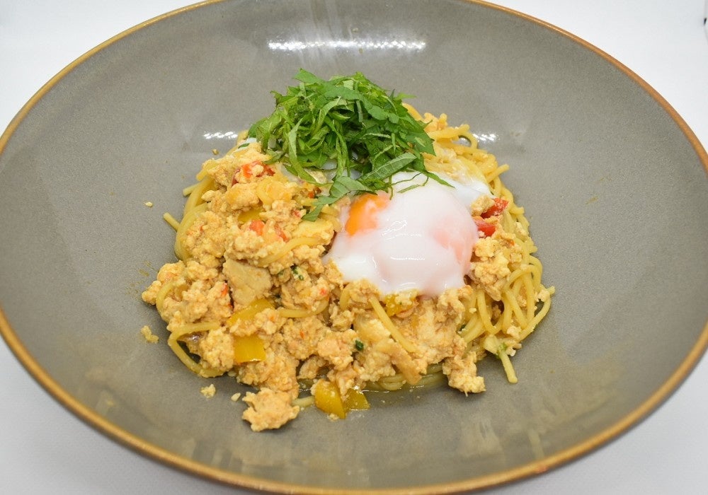 ピリ辛に仕上げた豆腐と鶏ひき肉のガパオミートに豆由来のパスタと豆乳スープを合わせた超ヘルシーヌードル
