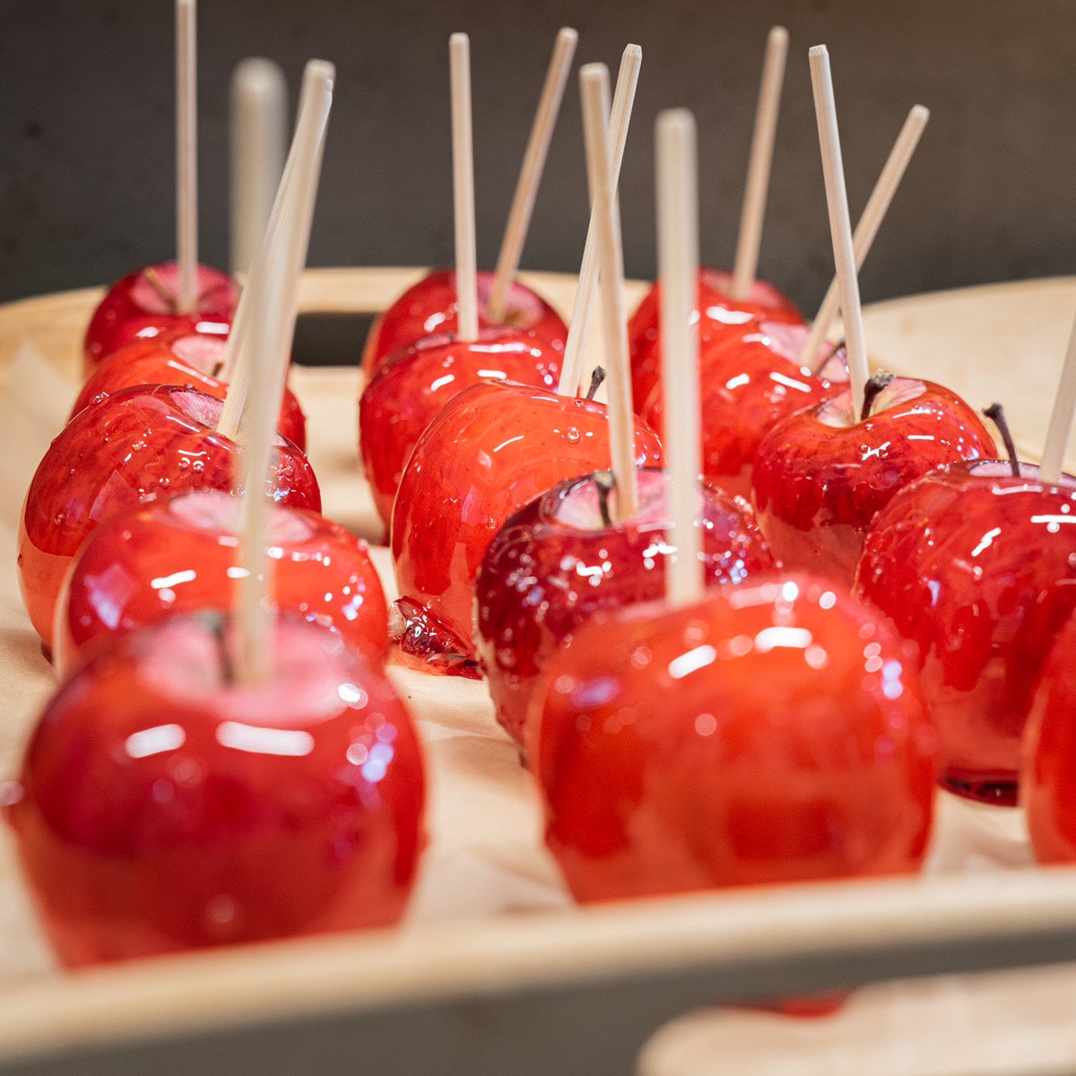 りんごの食感と、飴の食感に一体感が生まれるようにパリパリに仕上げ、ジューシーなりんごの果汁で、飴は口の中で一瞬で溶け混ざり合うよう薄くコーティングしています。そのため甘みの中に感じるりんご本来の酸味と甘い香りが口いっぱいに広がります。