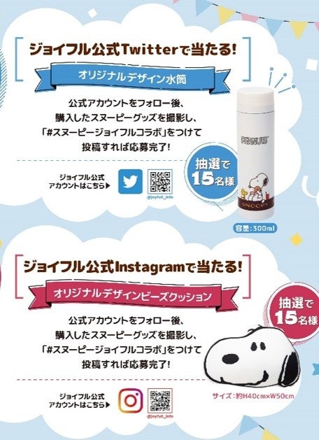 本キャンペーンでは、ジョイフル限定のオリジナルデザインを使用したスヌーピーグッズをご購入いただけます。また、店頭販売以外にもインターネットで購入できる通信販売限定オリジナル商品もご用意しています。同時に連動企画として、抽選でオリジナルデザイングッズが当たる公式SNSキャンペーンも実施いたします。