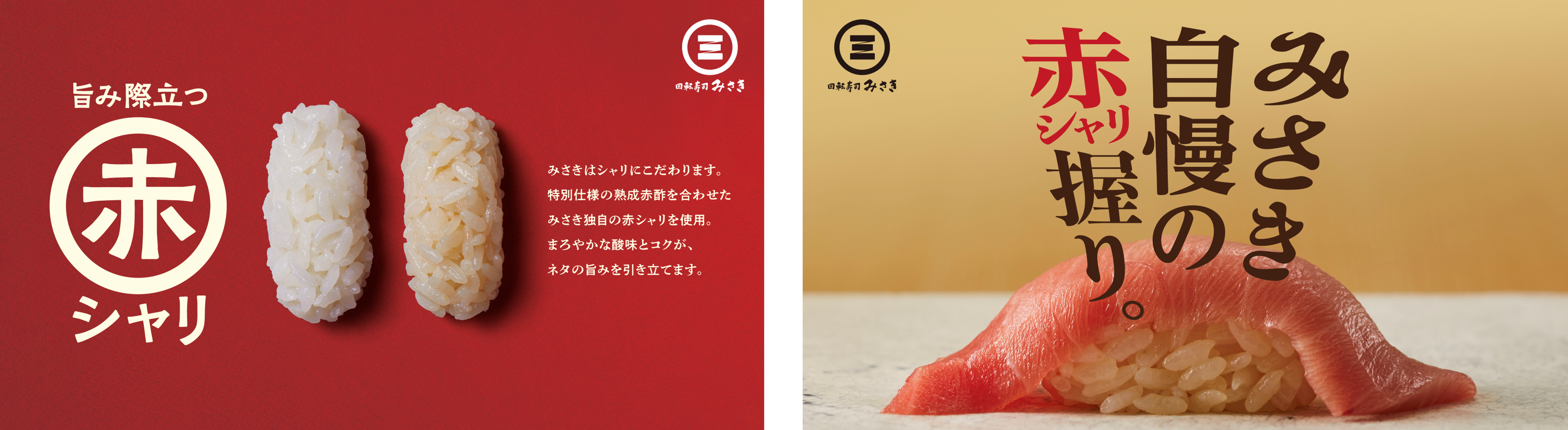 「回転寿司みさき」では、2023年3月から“赤シャリ”をリニューアルいたしました。赤酢を合わせた“赤シャリ”は、ネタの旨味を引き出し、寿司の旨さを決める重要な要素です。2年間じっくりと熟成させた酒粕を原料とした赤酢の割合を増やし、まろやかな酸味とコク・風味を感じられるように独自の酢の配合を行ったこだわりの“赤シャリ”でご提供をしています。