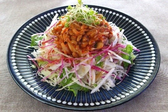 2種類の発酵食品を合わせてトッピングした健康感の高いサラダ。キムチの辛味が食欲をそそります。