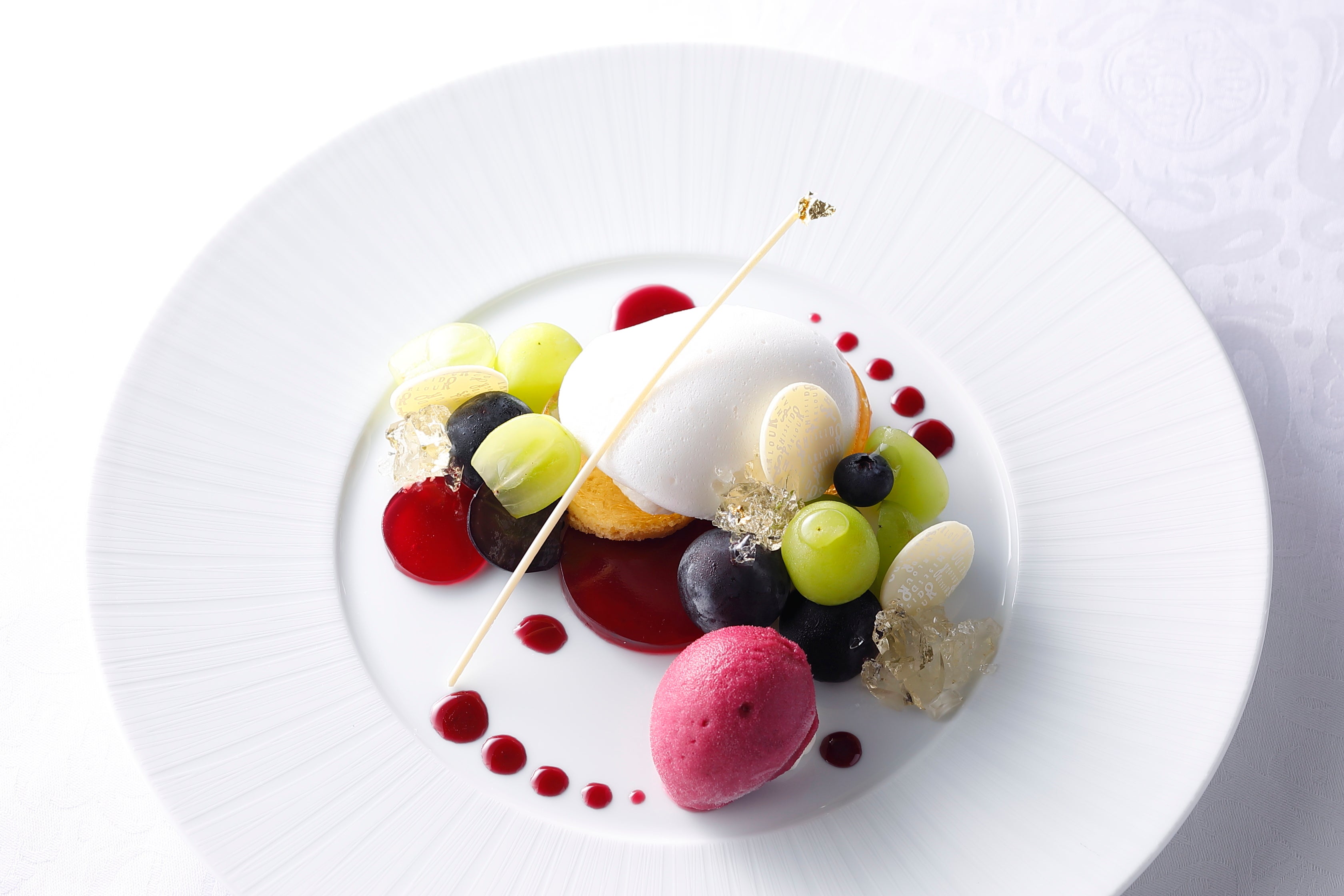 “シャインマスカット”や葡萄の果実の美味しさはもちろん、添えられている赤ワインソースや葡萄ソルベの美味しさもお楽しみいただけるひと皿です。