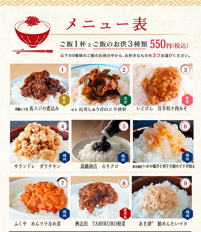 「ヒルナンデス」や「めざましテレビ」などさまざまなメディアに出演してきたご飯のお供専門家である長船が厳選した九州のご飯のお供9種類の中から3種を選び、高性能炊飯器で炊き上げた熊本県産のお米と一緒に味わうことができます。