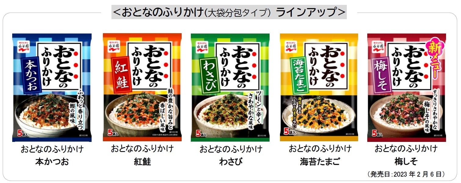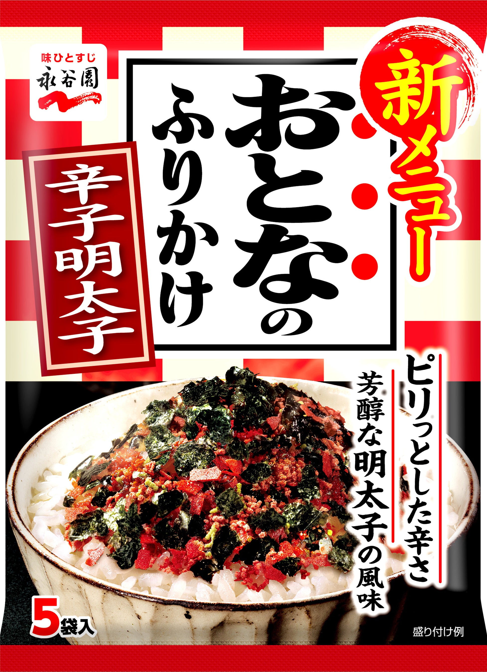 株式会社 永谷園(社長:成田 健一、東京都港区)の「おとなのふりかけ」シリーズは、それまでの「ふりかけ=子ども商品」という既成概念を打ち破り、「おとなが満足できるふりかけ」として、ふりかけ市場に新しい価値をもたらした商品です。1989 年の発売以来、30 年以上も大人向けふりかけの定番としてご好評いただいている本シリーズに、2023 年8 月28 日(月)より、新たに「おとなのふりかけ 辛子明太子」(税抜148 円)が仲間入り。たっぷりの海苔の存在感に負けず、辛子明太子特有の芳醇な風味をしっかりと感じることができる味わいに仕上げました。今後も、「おとな」が納得するふりかけのラインアップを強化することで大人需要を促進し、ふりかけ市場の活性化を図ってまいります。