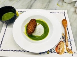 鶏のダシで炊き上げました。炊く時に鶏もも肉を入れることによって鶏の風味が移った美味しいお米になりました。生地のアパレイユにも米粉を使っています。