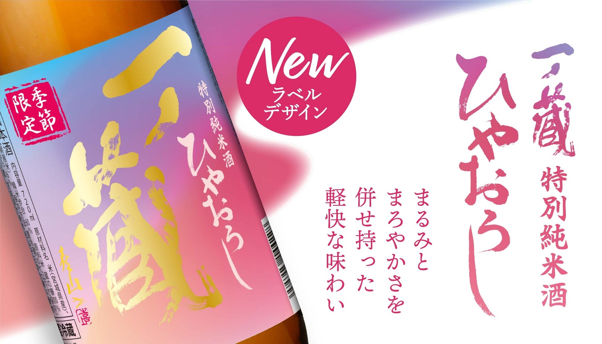 コンセプトは「まるみとまろやかさを併せ持った軽快な味わい」。これを基準に、天候や生育状況によって毎年品質が微妙に異なる原料米(宮城県の酒米「蔵の華」)の特性を最大限に活かし、蔵人の五感を駆使して醸した生詰め特別純米酒。一ノ蔵のひやおろしは、春先に搾ったお酒を加熱殺菌後に急速冷蔵し、熟成香を極力抑えたフレッシュ感のあるスッキリとした味わいに仕上がるのが特長で、今期より精米歩合を60%としたことで味に膨らみが加わり、やや丸みを帯びた仕上がりとなった。また、過度な酸の主張とアミノ酸の軽減など、酵母の特性を活かした雑味の少ない軽快さも表現されている。ラベルデザインも一新し、ひやおろしのやわらかくもフレッシュな味わいと、夏から秋への移り変わる情景をイメージした。