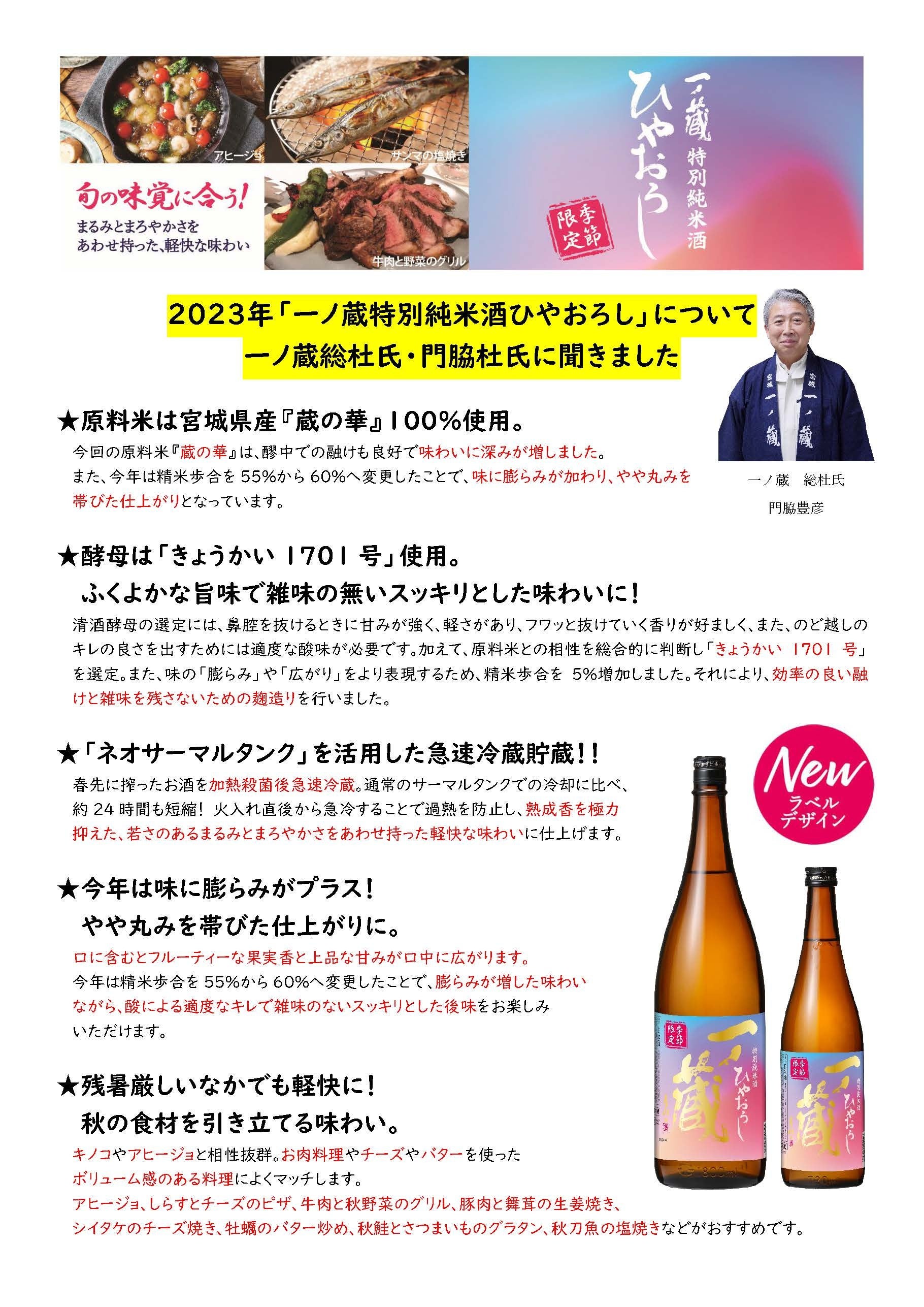コンセプトは「まるみとまろやかさを併せ持った軽快な味わい」。これを基準に、天候や生育状況によって毎年品質が微妙に異なる原料米(宮城県の酒米「蔵の華」)の特性を最大限に活かし、蔵人の五感を駆使して醸した生詰め特別純米酒。一ノ蔵のひやおろしは、春先に搾ったお酒を加熱殺菌後に急速冷蔵し、熟成香を極力抑えたフレッシュ感のあるスッキリとした味わいに仕上がるのが特長で、今期より精米歩合を60%としたことで味に膨らみが加わり、やや丸みを帯びた仕上がりとなった。また、過度な酸の主張とアミノ酸の軽減など、酵母の特性を活かした雑味の少ない軽快さも表現されている。ラベルデザインも一新し、ひやおろしのやわらかくもフレッシュな味わいと、夏から秋への移り変わる情景をイメージした。