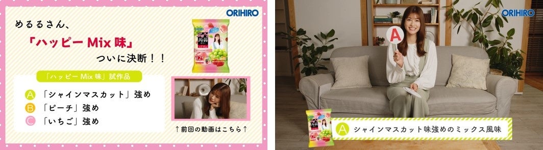 なんと「ぷるんと蒟蒻ゼリー」の人気上位の味ばかり!そこで、オリヒロでは、この3つの味を一つに詰め込んだ「ハッピーMix味」の商品開発に着手。生見さん本人に試食をしてもらいながら味をブラッシュアップ!3つのパターンの試作品から、生見さんが悩みに悩んで選んだ“ベストハッピーMix”を限定発売いたします。
