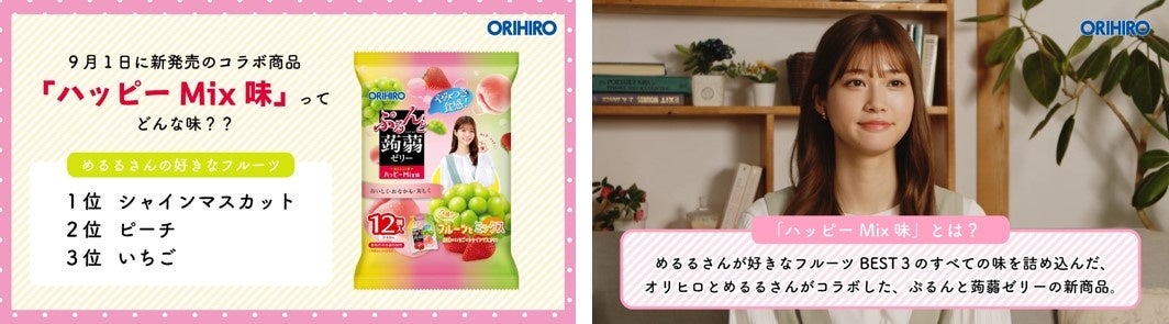 生見愛瑠さんとのコラボ商品『ぷるんと蒟蒻ゼリー ハッピーMix味』は、生見さんが好きなフルーツBEST3(シャインマスカット、ピーチ*、いちご)の味を1つに詰め込んだ「ぷるん蒟蒻ゼリー」の特別な新商品です。