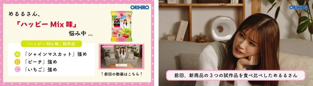 8月17日(木)の第1弾では、生見さんが試作品の食べ比べをする「初試食! 篇」、8月28日(月)の第2弾は、どの味を選ぶか悩んでいる「悩み中・・・ 篇」、そして9月1日(金)の第3弾では、結果発表とファンへのメッセージを含んだ「選ばれたのは!? 篇」の3つ動画を順次公開していきます。生見さんが好きな「シャインマスカット」「ピーチ」「いちご」の3種類のフルーツが合わさった「ハッピーMix味」とは、そして、生見さんが最終的に選んだのはどのような味なのか、ぜひご注目ください。