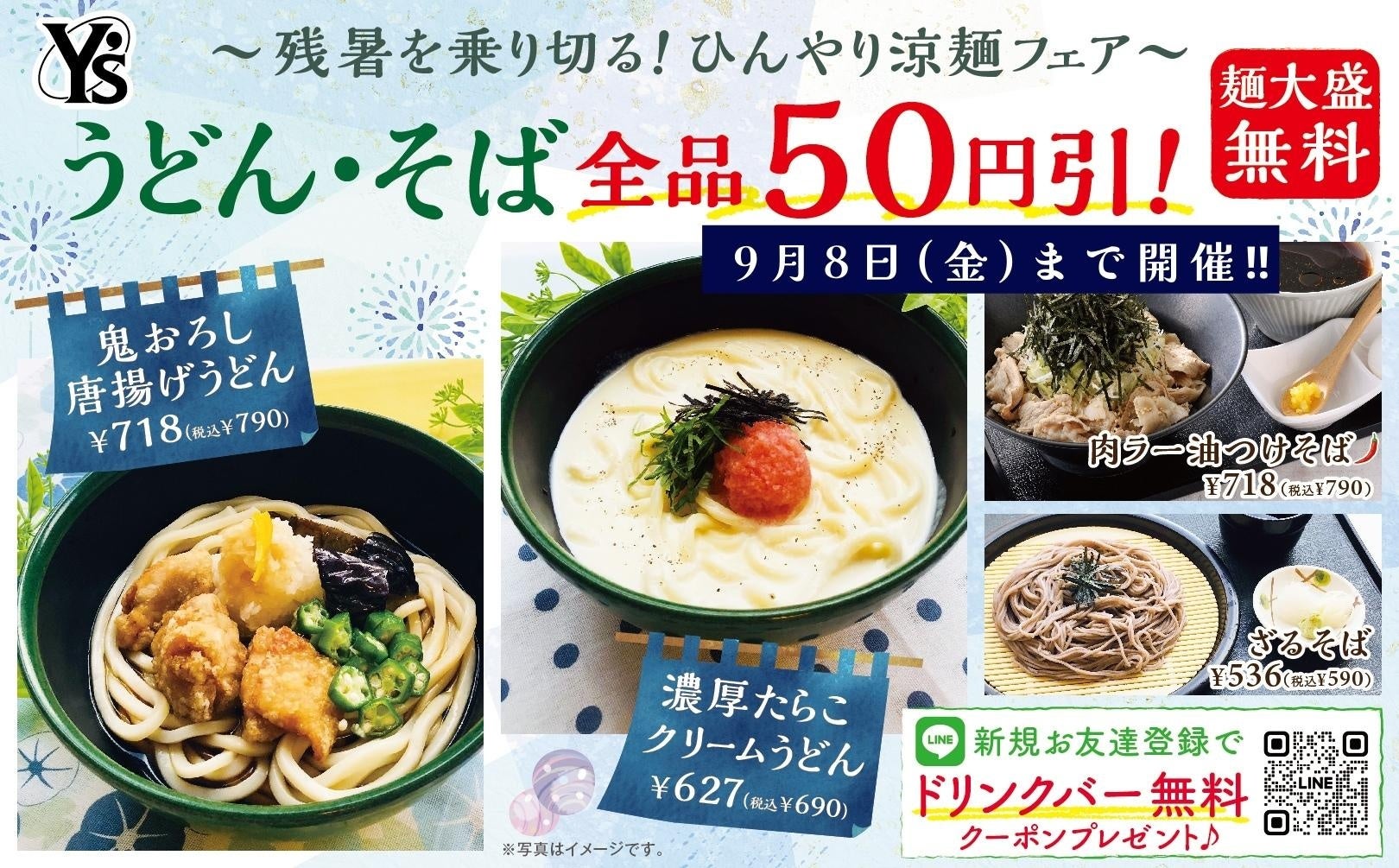 そしてこの度、2023年8月24日(木)~ 2023年9月8日(金)の期間限定にて、新メニュー含む、うどん・そばが全品50円引き!『ひんやり涼麺フェア』を開催いたします!