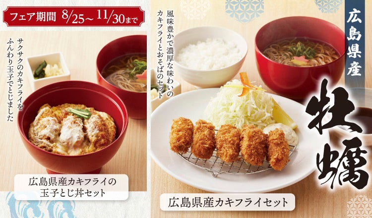 定番の『広島県産カキフライセット』は、サクサクの揚げたてのカキフライをとんかつソースとタルタルソースでお召し上がりいただき、『広島県産カキフライの玉子とじ丼セット』は家族亭自慢のおだしと玉子でカキフライをふんわりとじたうまみたっぷりのおどんぶりです。ぜひ、家族亭こだわりのおそばと一緒にお楽しみください。