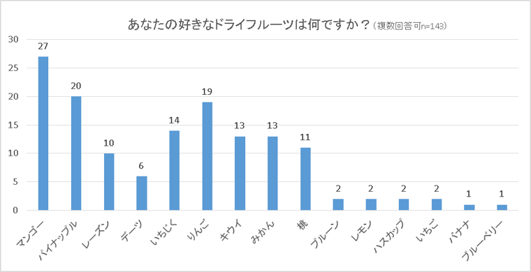 商品の開発にあたり、当社は、「あなたの好きなドライフルーツは何ですか?」というアンケートを実施したところ、『マンゴー』という回答が最も多い結果となりました。<図1>※インターネット調査 47人に実施(2023年7月)