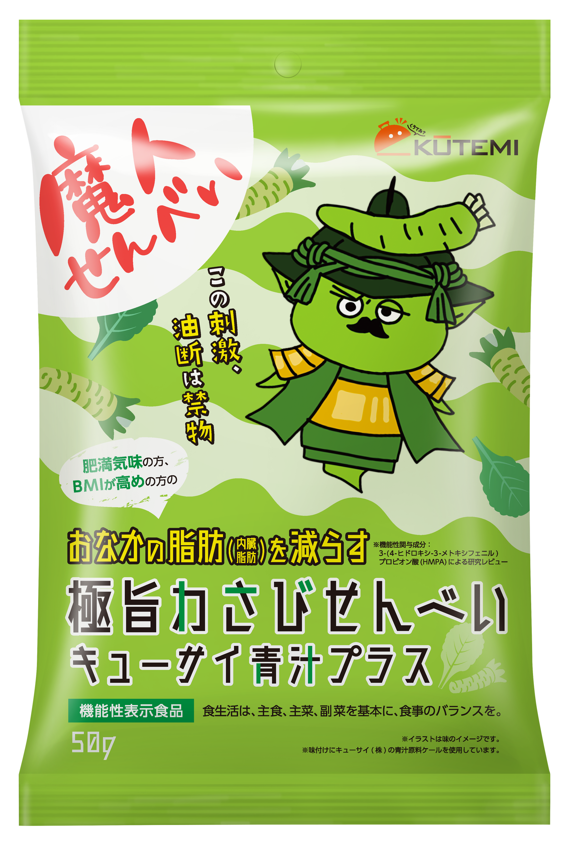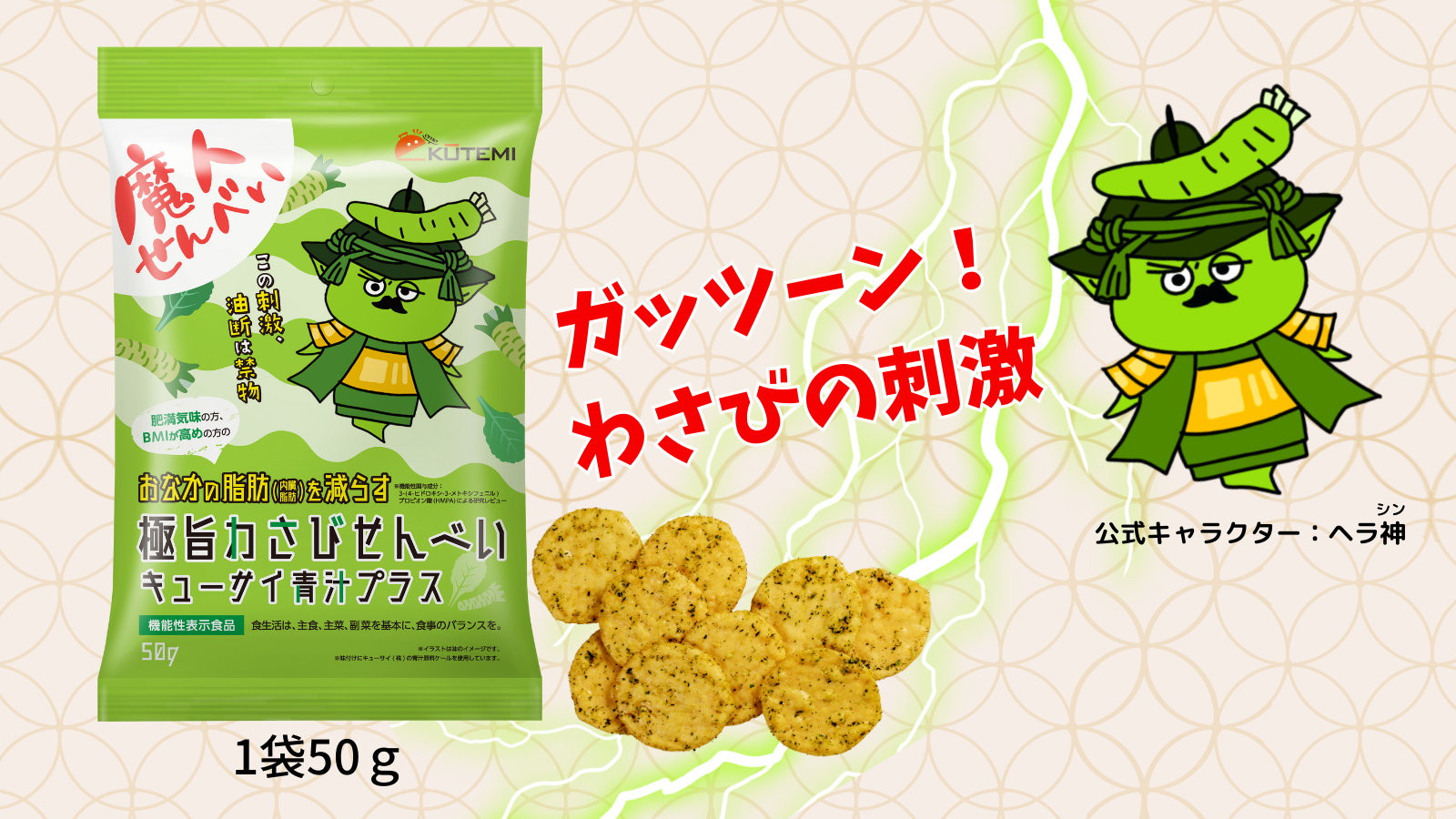 この魔人せんべいシリーズ第2弾として、同じ福岡に拠点を置くキューサイ株式会社と、ライトな健康志向をもった多くの方の健康に貢献できる商品を、との想いで、おやつ・おつまみにご利用できる機能性表示食品のおせんべいを開発。2023年9月下旬に上市いたします。