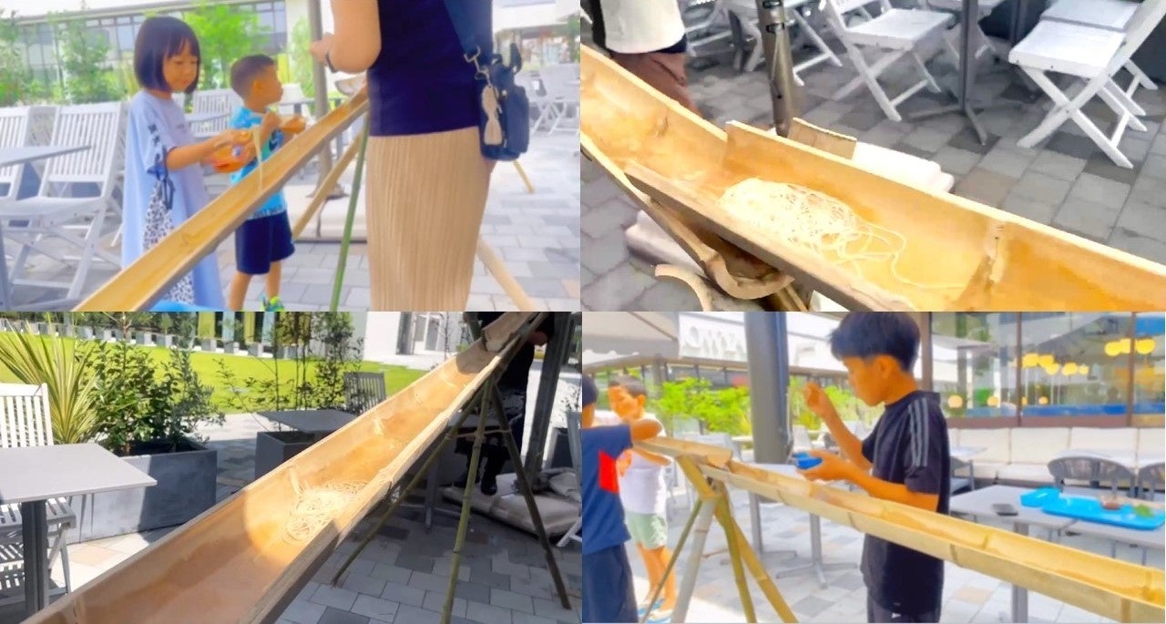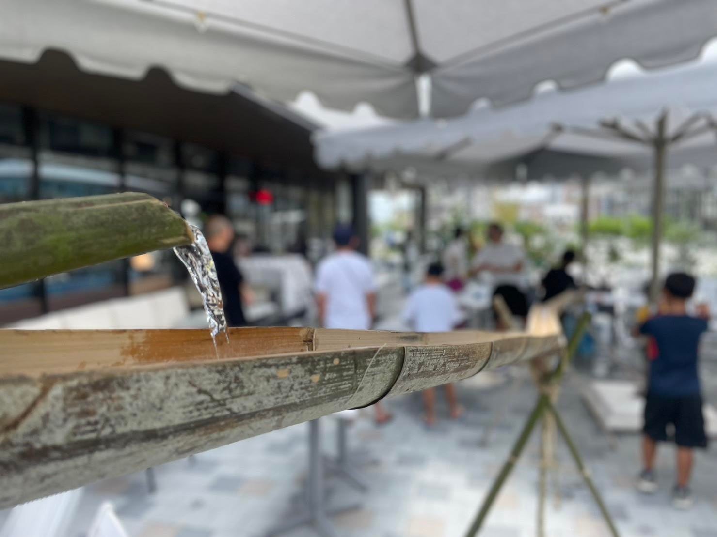 全長5mを超える竹の水路を流れてくるそうめんをすくって、ITO GRANDに構える個性豊かな各店舗ならではの味を楽しめるオリジナルつゆでご賞味いただきます。
