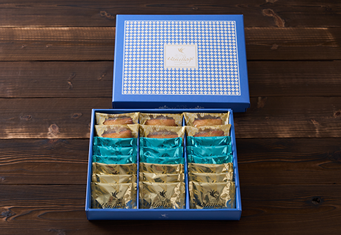 大丸東京店、大丸梅田店の催事出店時にお客様からご意見いただき誕生したセット商品です。『バニラージュ』シリーズの人気商品を贅沢にも3種類(ディアマンバニーユ・カカオバニーユ・バニラフィナンシェ)詰め合わせたアソートボックス。高級感あるブランドカラーのブルーを基調にした化粧箱に詰め合わせました。