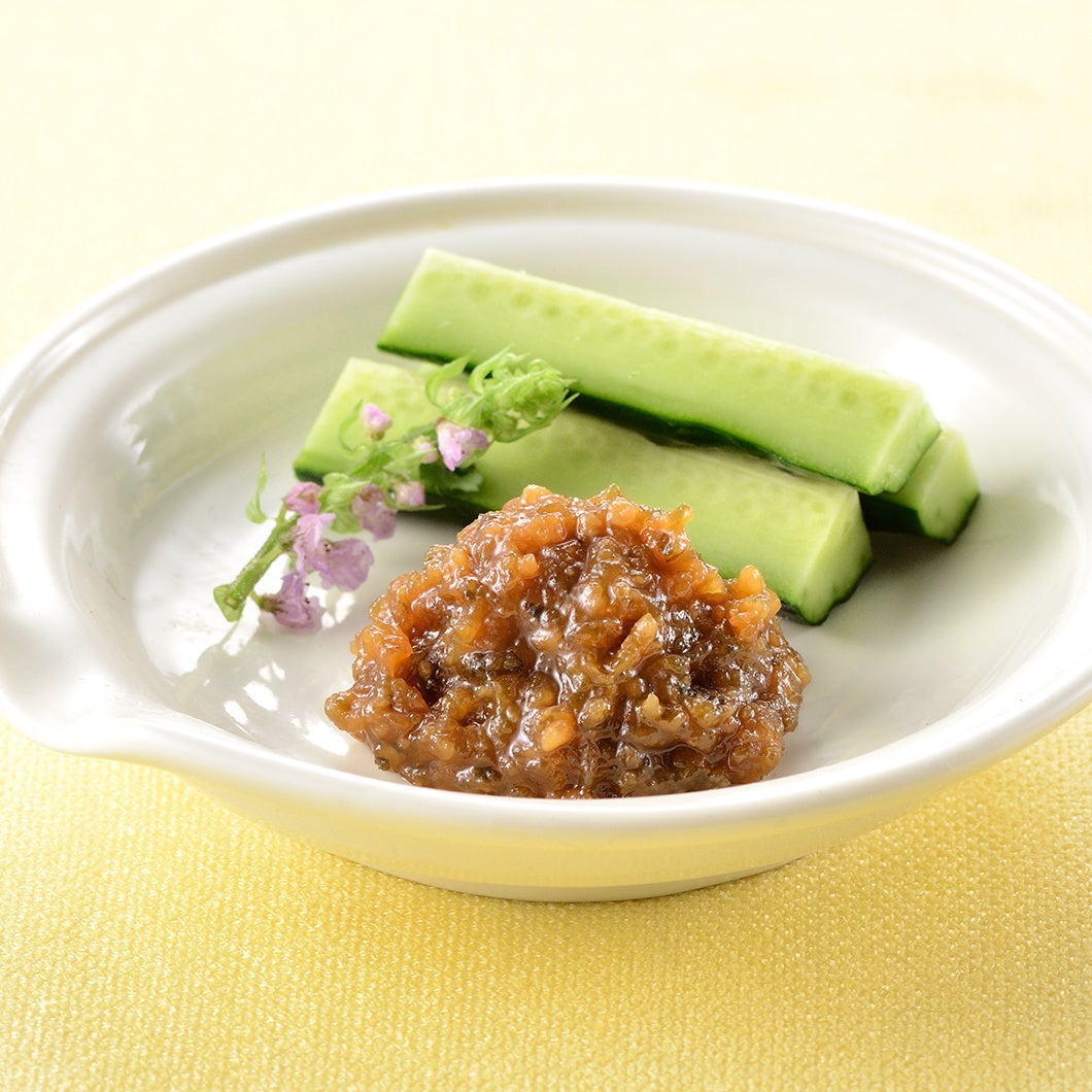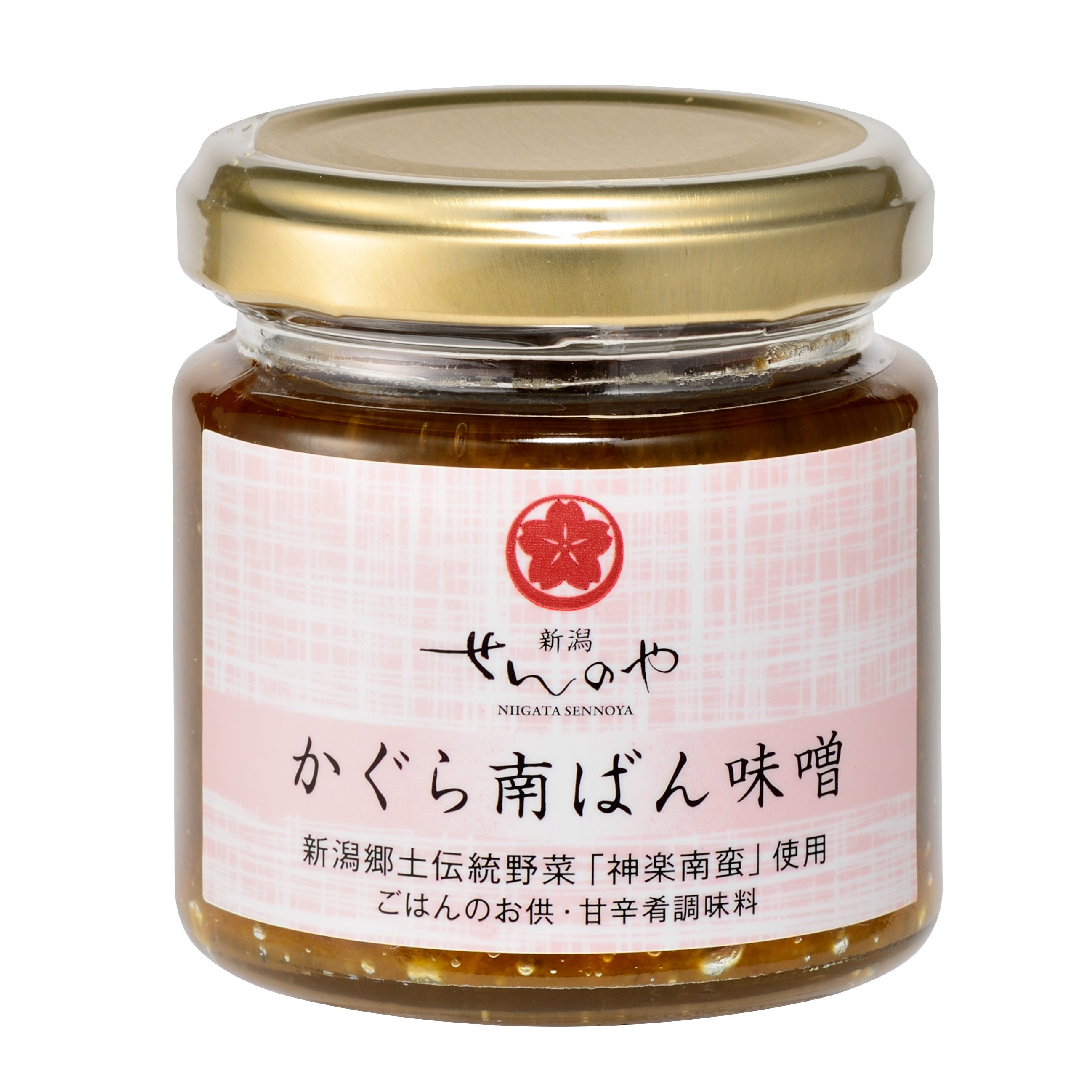 新潟県の伝統野菜の一つである唐辛子の一種「神楽南蛮」を越後米・有機栽培大豆・赤穂の天塩を使って丹誠込めて仕込んだ越後味噌と大葉と砂糖と合わせ、職人が手作業で丹念に練り込みました。季節や気温で変わる仕上がり状態を見極めるのは正に職人技。炊き立てご飯と一緒に食べると「ついつい食べ過ぎてしまう」ほど、相性抜群の一品です。