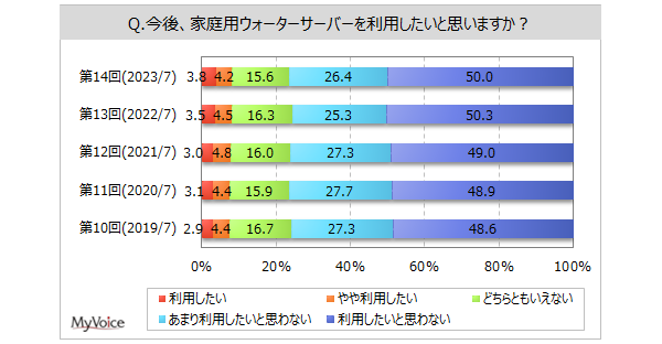 ウォーターサーバーの利用意向者は、「利用したい」「やや利用したい」を合わせて8.0%です。