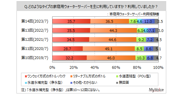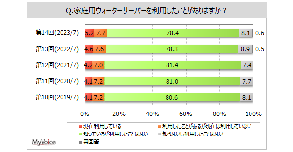 <今 回>(2023/7)https://myel.myvoice.jp/products/detail.php?product_id=30003 上記設問の他に、「利用している飲料水」「ウォーターサーバーの満足度」なども聞いています。 <第13回>(2022/7)https://myel.myvoice.jp/products/detail.php?product_id=28808 <第12回>(2021/7)https://myel.myvoice.jp/products/detail.php?product_id=27605 |