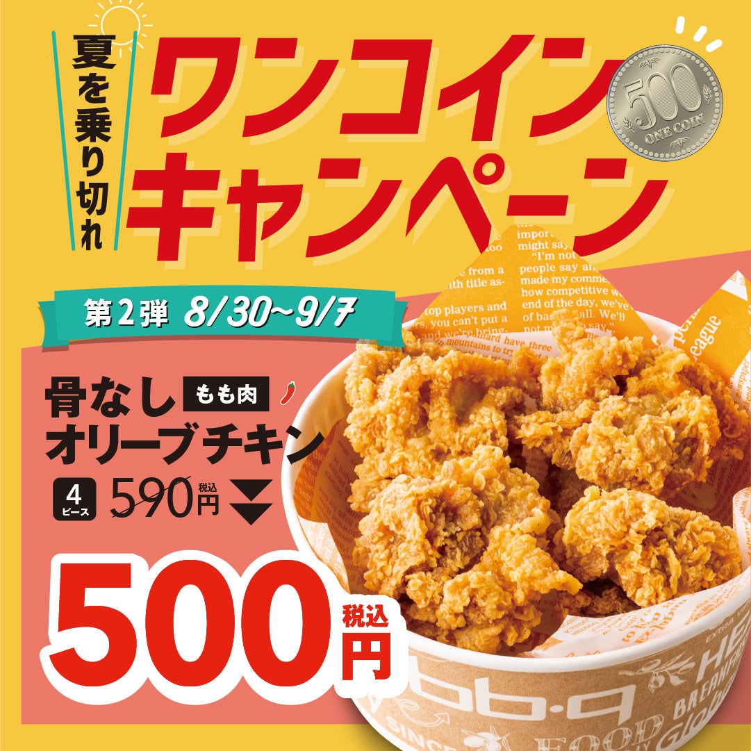 『bb.qオリーブチキンカフェ』は現在、残暑続く夏を乗り切るオトクなワンコインキャンペーンを実施中です。