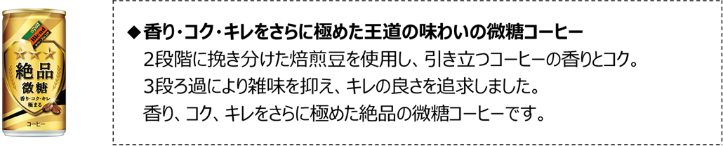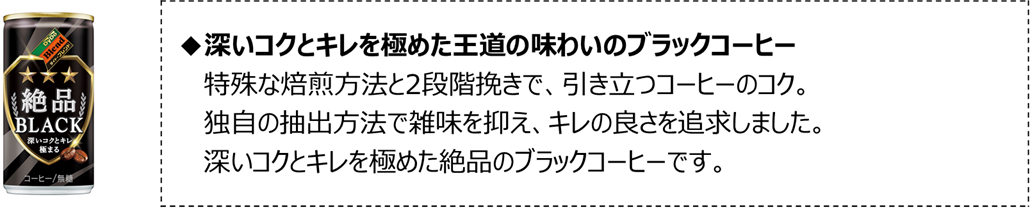 「ダイドーブレンド 絶品微糖」は2段階に挽き分けた焙煎豆を使用し、コーヒーの香りとコクを引き立たせ、3段ろ過により雑味を抑えてキレの良さを追求しました。「ダイドーブレンド 絶品カフェオレ」は、牛乳、生クリーム、練乳を使用し、ミルクのおいしさを追求しました。また、「ダイドーブレンド 絶品ブラック」は特殊な焙煎方法と2段階挽きでコーヒーのコクを引き立たせ、独自の抽出方法により雑味を抑え、キレの良さを追求しました。