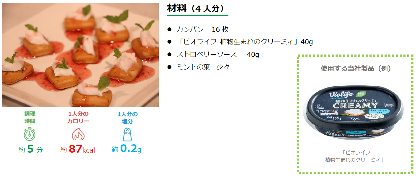 なんとカンパンでおいしいスイーツまで作れます!今回は当社の植物性チーズ「Violife(ビオライフ)」のクリーミィを用いて健康を意識される方にもぴったりのおやつを考案しました。ぜひお試しください。