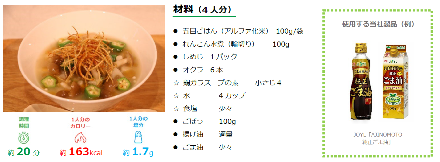 この調査結果を受け、当社テストキッチン「おいしさデザイン工房®」所属シェフが考案した、非常食を日常でもっとおいしく食べるアレンジレシピと、収納しやすくローリングストックに適した紙パック入りの食用油「スマートグリーンパック®」シリーズをご紹介いたします。防災を意識しながらおいしくフードロスを削減する方法をご提案することで、今後も「おいしさ×健康×低負荷」の実現を目指してまいります。