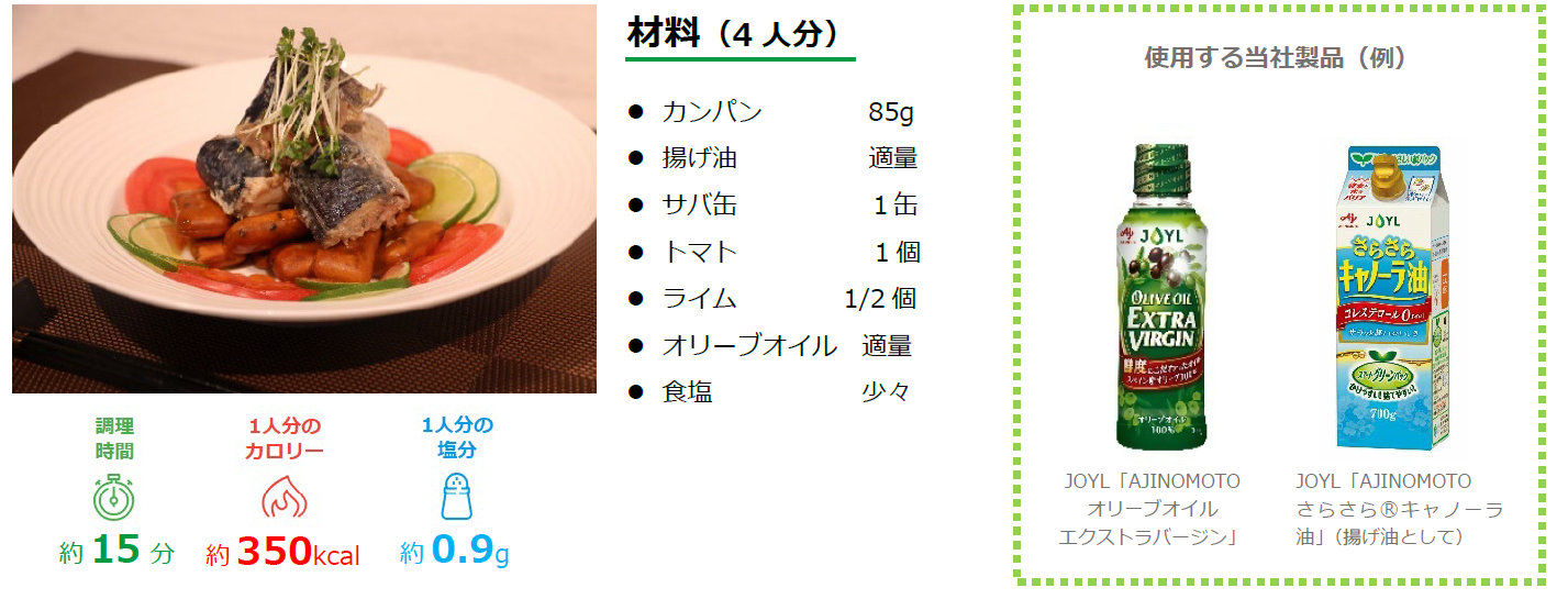 調査結果で「非常食として備蓄している食料」のNo.1だったのは缶詰。缶詰のカンパンとサバ缶を用いて、簡単においしいメイン料理が作れます。カンパンは油で揚げることによって、パサつきが気にならなくなり、食感も良くなり、コクが出ます。またオリーブオイルを仕上げにかけることで風味が良くなり食べやすくなります。サバを崩し、揚げカンパンと一緒にお召し上がりください!
