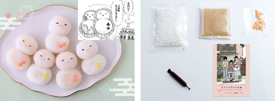セット内容は、白玉粉・白あん・チョコペン・トッピングシュガー、動画付きレシピカードの5点。2回分がセットになっているため、作品中に登場する「三日月町ふくふくダルマ」を再現した後は、好きなキャラクターの顔を描いたり、お好みのフルーツを入れたジューシーなフルーツ大福など、アレンジも楽しめます。